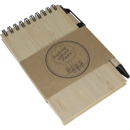Notes o formacie A6 z bambusową okładką, zamykany na gumkę. Notes posiada 140 niezadrukowanych stron, dodatkowo wyposażony został w długopis, który dzięki pętelce przy notesie, zawsze będzie pod ręką.
