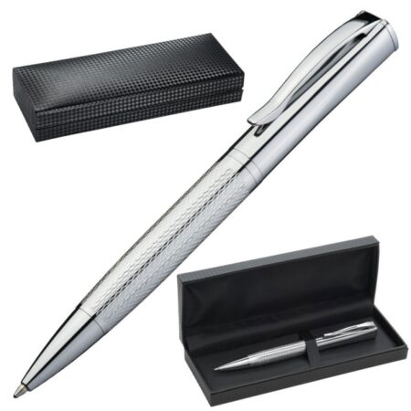 Elegancki metalowy długopis piszący na niebiesko, uzupełnieniem do niego jest odpowiednio dobrane etui. Doskonale sprawdzi się jako prezent.