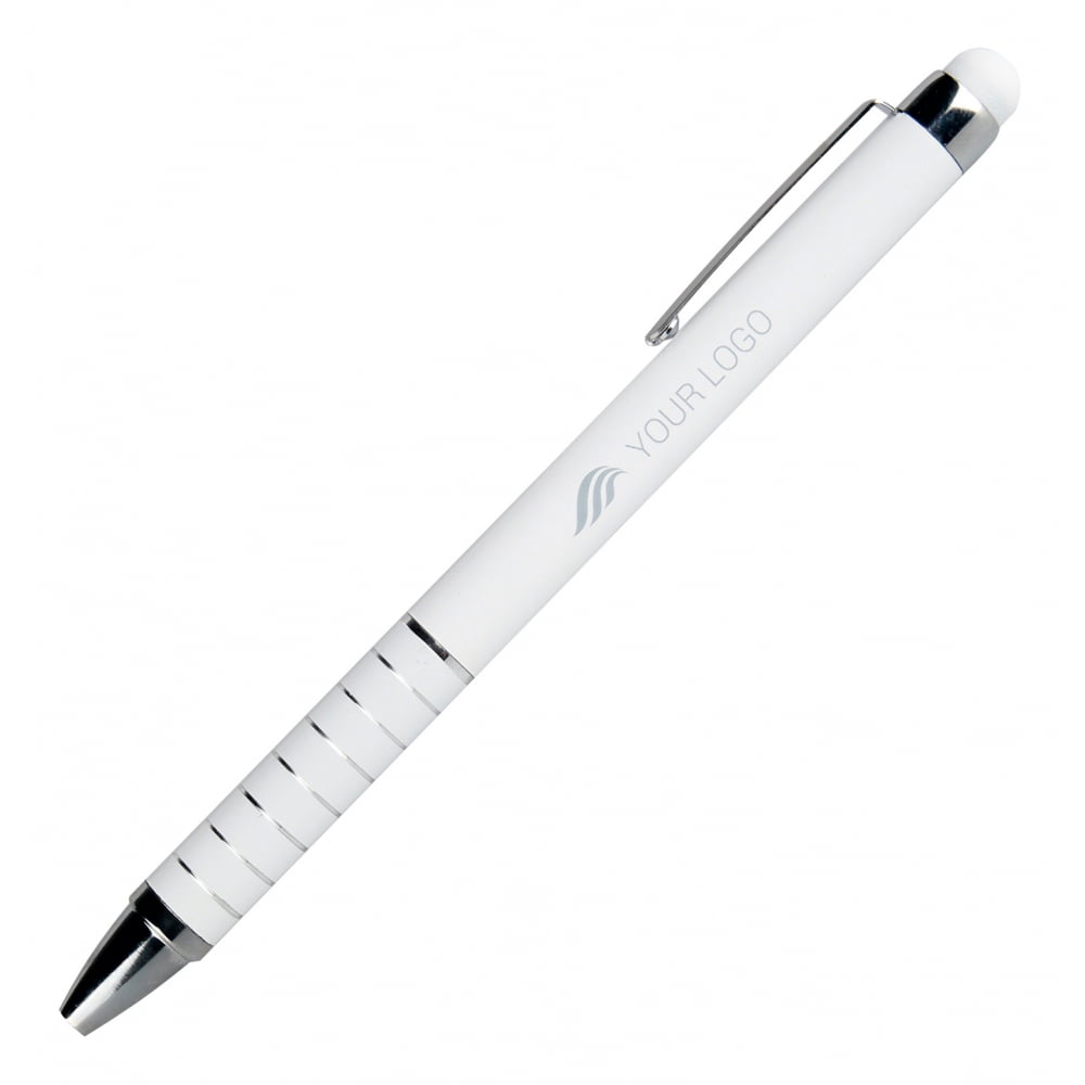 Długopis metalowy z mechanizmem obrotowym i gumką do obsługi ekranów dotykowych. Posiada wkład piszący na niebiesko.