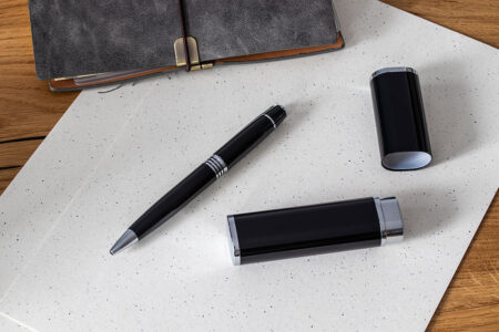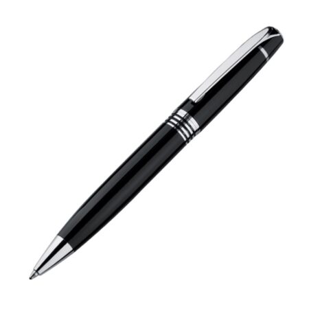 Metalowy długopis z mechanizmem obrotowym, z wkładem piszącym na niebiesko, umieszczony w metalowym etui.