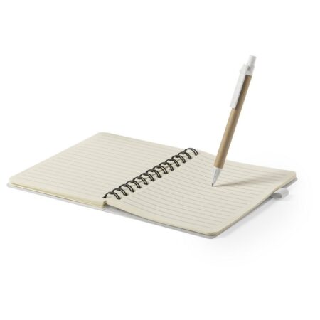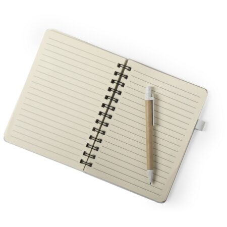 Notatnik (ok. A5, 80 kartek w linie) z włókien słomy pszenicznej, twarda okładka, długopis w komplecie, spiralne bindowanie