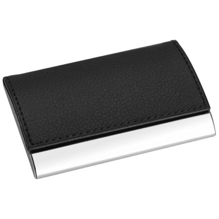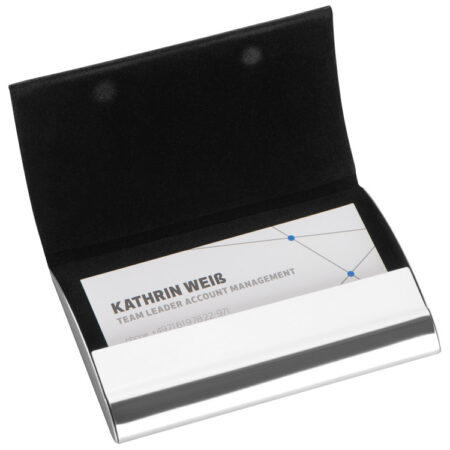 Metalowe, błyszczące etui na wizytówki. Wieko pokryte jest skórą ekologiczną. Etui zamykane na magnes.