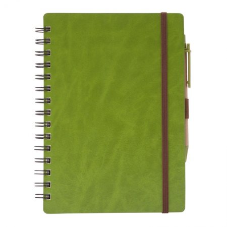 Oprawiony w gładką ekoskórę notatnik ze spiralą, zamykany elastyczną taśmą. 70 kartek w linie, papier 70 g/m². Wyposażony w długopis z recyklingu oraz papierową kieszeń na III stronie okładki. Wkład w kolorze niebieskim.