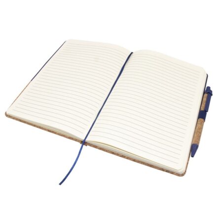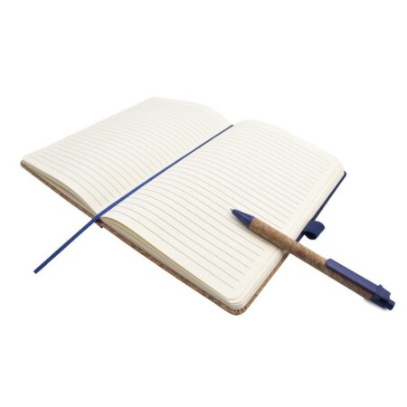 Notatnik A5 (80 kartek w linie), twarda okładka wykonana z korka i bawełny, tasiemka zakładkowa i elastyczna opaska do zamykania, długopis z korkowym trzonem i kolorowymi elementami z włókien słomy pszenicznej w komplecie.