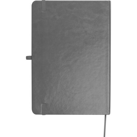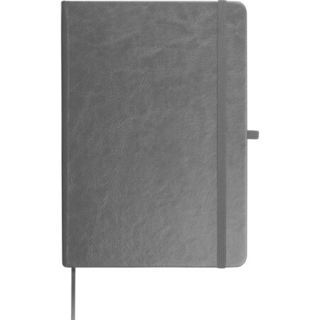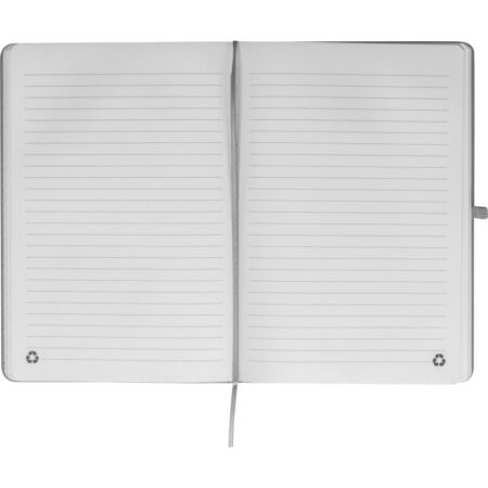 Notes o formacie A5, z okładką wykonaną z PU pochodzącego z recyklingu, posiada 192 strony w linię, zamknięcie na gumkę, materiałową zakładkę i pętelkę na długopis