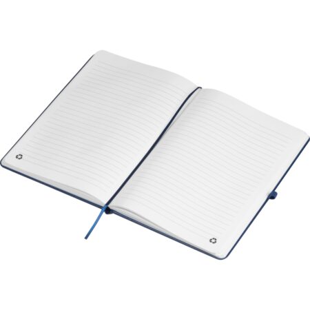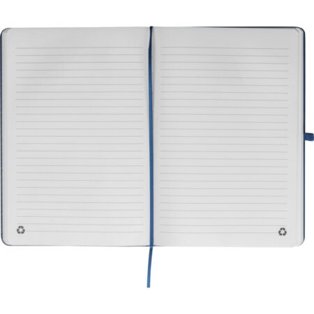 Notes o formacie A5, z okładką wykonaną z PU pochodzącego z recyklingu, posiada 192 strony w linię, zamknięcie na gumkę, materiałową zakładkę i pętelkę na długopis