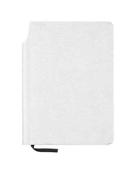 Notes formatu A5 w kolorze białym. Notes zawiera 96 kartek w linie oraz praktyczną zakładkę – wstążeczkę. Okładka notesu wykonana z miękkiej ekoskóry, nieusztywniana. Wewnątrz grzbietu notesu ciekawie zaprojektowane miejsce na długopis.