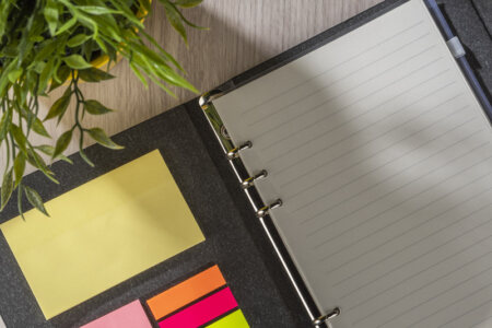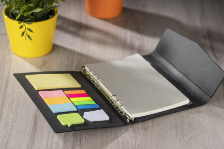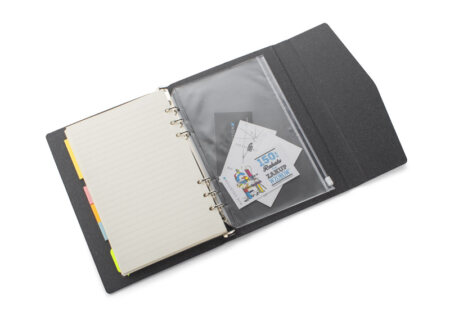 Organizer zawiera 60 kartek w linie z możliwością ich wymiany. Dzięki temu produkt posłuży na długi czas. Wewnątrz znajdują się kolorowe karteczki samoprzylepne, a także transparentna kieszonka zamykana na suwak do przechowywania artykułów biurowych, czy wizytówek.j. Okładka zamykana na magnes, wykonana z papieru.