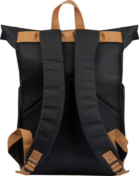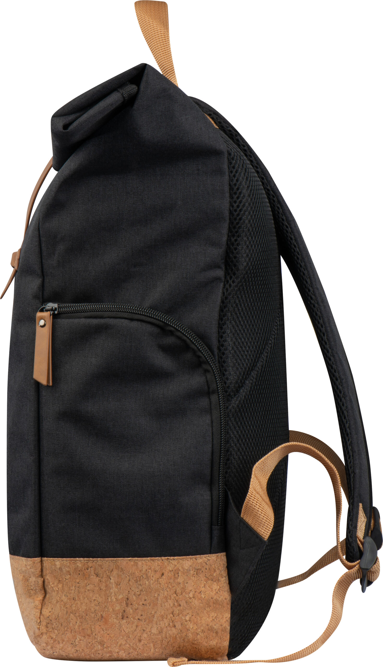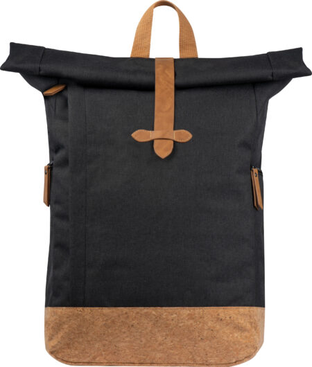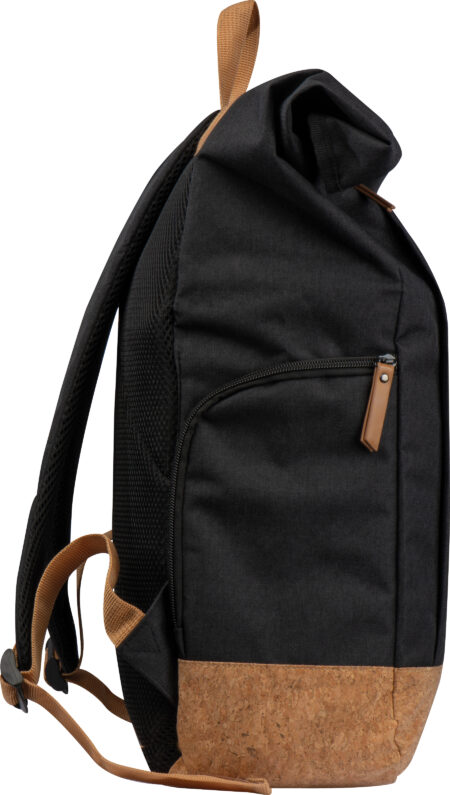 Plecak wykonany z poliestru 300D i RPET 210D. Komora główna zamyka się poprzez zrolowanie i zapięcie. Plecak posiada 2 kieszonki boczne zamykane na zamek, regulowane szelki i uchwyt do przenoszenia oraz dno wykończone korkiem.