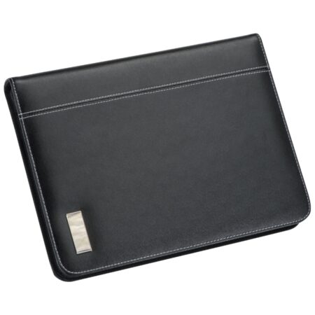 Folder A4 z wysokiej jakości skóry mielonej. Posiada kieszeń na tablet, kieszenie na wizytówki, kieszeń i podstawkę pod telefon, szlufki na długopisy oraz notes w linie z małym kalendarzem. Zamykana na zamek błyskawiczny.