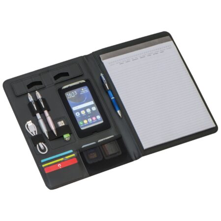 Folder A4 z wysokiej jakości skóry mielonej. Posiada liczne przegródki, kieszeń i podstawkę pod telefon, miejsce na długopisy oraz notes w linie z małym kalendarzem.