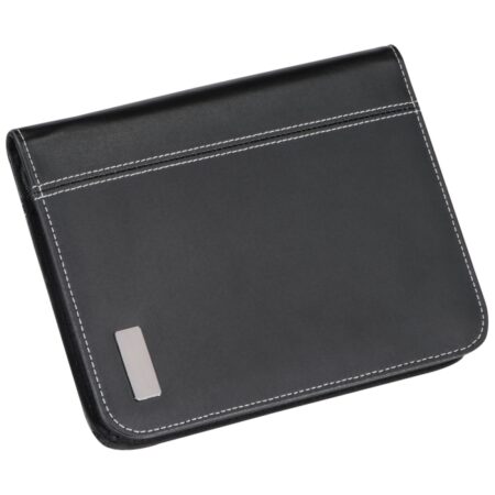 Folder A5 z wysokiej jakości skóry mielonej. Posiada kieszenie na wizytówki, telefon i szlufki na długopisy oraz notes w linie z małym kalendarzem. Zamykany na zamek błyskawiczny.