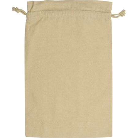Duży woreczek bawełniany wykonany z bawełny pochodzącej z recyklingu, z certfikatem Oeko-Tex® STANDARD 100, gramatura 110g/m². Woreczek zamykany za pomocą sznureczków ściągających.