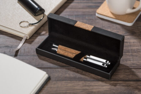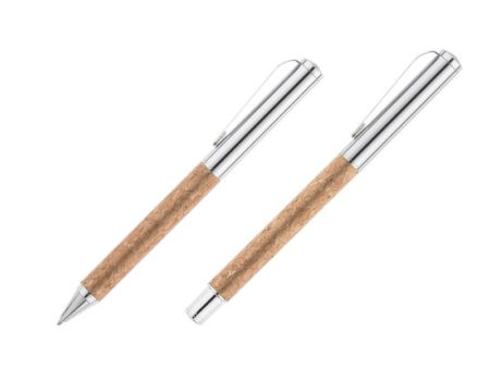 Elegancki zestaw piśmienniczy dla miłośników naturalnych materiałów przyjaznych środowisku. W zestawie znajduje się długopis oraz pióro kulkowe wykonane z metalu oraz korka. Gustowne etui w kolorze czarnym ozdobione elementem korkowym. Długopis z mechanizmem typu twist, z czarnym wkładem, pióro kulkowe z zatyczką, z wkładem w kolorze czarnym.
