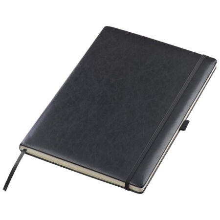 Notes formatu A4 z twardą okładką pokrytą tworzywem sztucznym w optyce skóry naturalnej i 80 kartkami w linie.