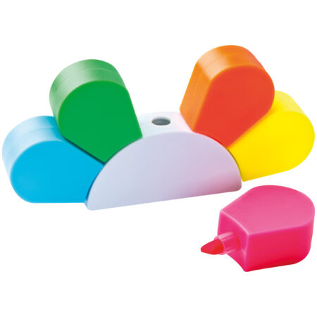 Kolorowe zakreślacze w kształcie kwiatka w pięciu popularnych kolorach. Logotyp proponujemy umieścić na białym, plastikowym elemencie.
